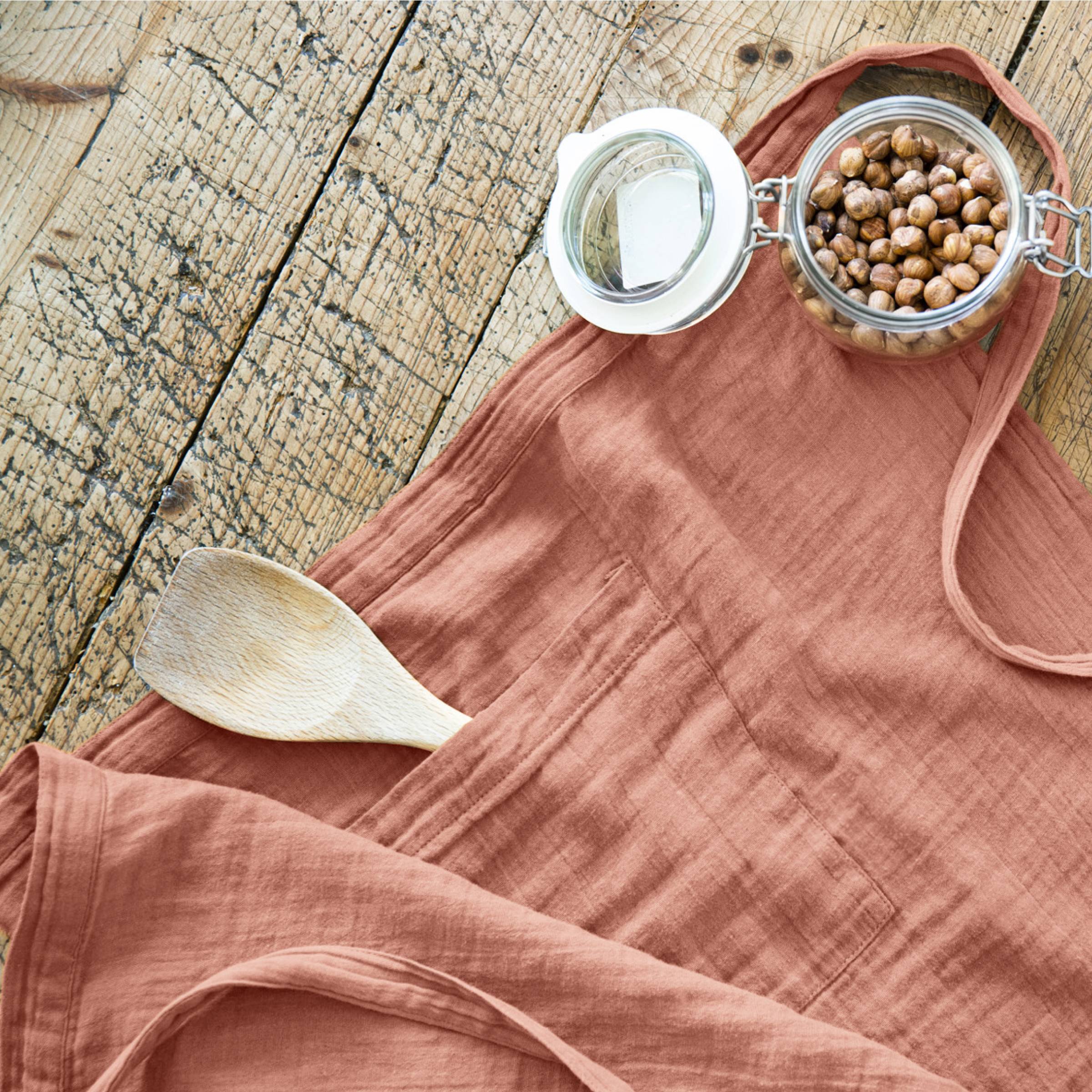 Deze katoengaas keukenschort, met natuurlijk reliëf, hoeft niet gestreken te worden.
